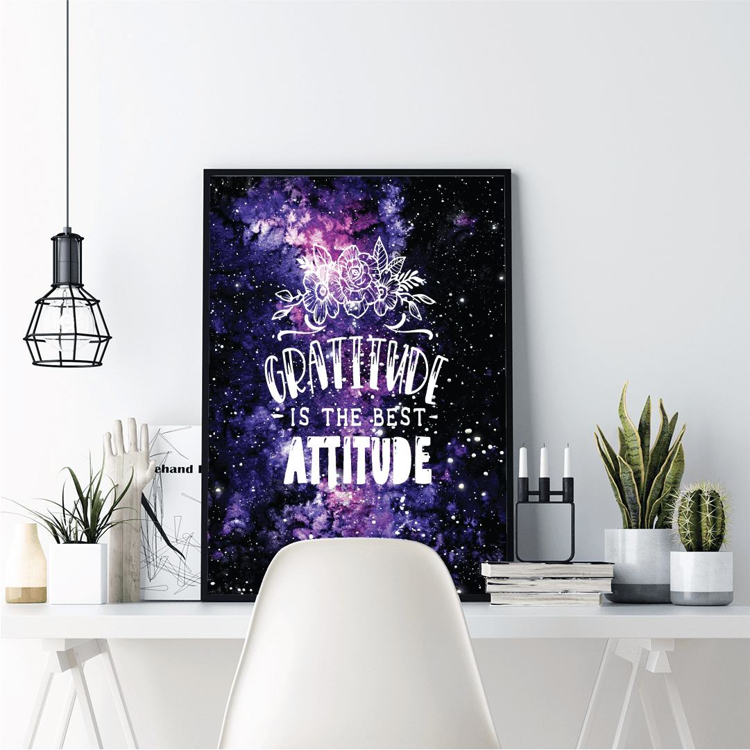 Elevate your space with the inspiring message of this Gratitude Is the Best Attitude poster, designed to bring positivity, mindfulness, and vibrant color into any room. This 11 x 17 inch poster is printed on premium 330gsm BlackCore embossed cardstock with a luxurious dimpled texture. Featuring a striking galaxy-inspired background filled with deep purples, blues, and soft starry textures, this artwork naturally draws the eye while reinforcing a powerful daily reminder.